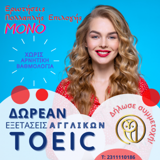 «Δηλώστε δωρεάν συμμετοχή σε πιστοποίηση της αγγλικής γλώσσας. Οι εξετάσεις είναι αναγνωρισμένες από τον ΑΣΕΠ και διεξάγονται από την Ελληνοαμερικανική Ένωση. Τα εξέταστρα καταβάλλονται μόνο σε περίπτωση επιτυχίας στις εξετάσεις και εφόσον επιθυμείτε την έκδοση του πιστοποιητικού!