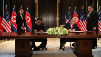Οι ηγέτες των ΗΠΑ και της Βόρειας Κορέας υπέγραψαν ένα κείμενο, ενώ ο πρόεδρος Τραμπ ευχαρίστησε τον Κιμ για την επιτυχή διάσκεψη που είχαν. Περισσότερες λεπτομέρειες θα ανακοινωθούν σε συνέντευξη Τύπου.