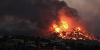 Οι άνεμοι σπρώχνουν τη φωτιά σε νότια κατεύθυνση, προς τα Αθίκια και το Χιλιομόδι.