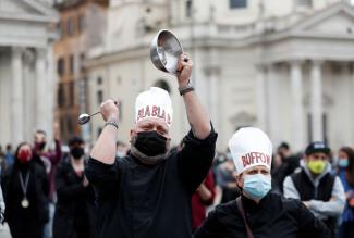 Παρ’ όλο που μεγάλο μέρος της Ιταλίας εξακολουθεί να υπόκειται σε αυστηρούς περιορισμού λόγω της πανδημίας του κοροναϊού, εστιατόρια και μπαρ άνοιξαν τις πύλες τους σε ένδειξη διαμαρτυρίας. Οι πελάτες ήπιαν, έφαγαν, τραγούδησαν -αδιαφορώντας για τα μέτρα υγειονομικής προστασίας σε μια χώρα που έχει θρηνήσει δεκάδες χιλιάδες νεκρούς- ενώ σε βίντεο που έχει γίνει viral καταγράφεται να διώχνουν τους αστυνομικούς που επιχείρησαν να επέμβουν.