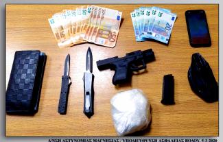 Συνελήφθη, σήμερα τις πρώτες πρωινές ώρες στη Νέα Εθνική Οδό Αθηνών-Θεσσαλονίκης, από αστυνομικούς της Ομάδας Πρόληψης και Καταστολής Εγκληματικότητας (Ο.Π.Κ.Ε.) Βόλου, ένας 38χρονος, σε βάρος του οποίου σχηματίστηκε δικογραφία για παράβαση των νόμων περί ναρκωτικών και περί όπλων.