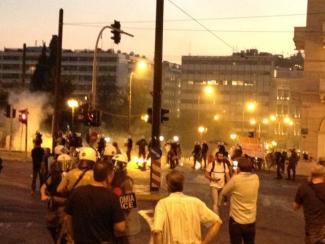 Η ένταση ανάμεσα στους κουκουλοφόρους και τα ΜΑΤ στην πλατεία Συντάγματος ξεκίνησε περίπου στις 21:00 με τους τελευταίους να εκτοξεύουν βόμβες μολότοφ, ξύλα, πέτρες και καπνογόνα εναντίον των αστυνομικών.
