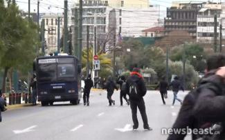 Ομάδα νεαρών με καλυμμένα τα πρόσωπά τους που ακολουθούσαν την μαθητική πορεία στο κέντρο της Αθήνας, επιτέθηκαν με καδρόνια κι άλλα αντικείμενα σε κλούβα των ΜΑΤ που ήταν σταθμευμένη στη λεωφόρο Βασιλίσσης Αμαλίας, έξω από το Ζάππειο.