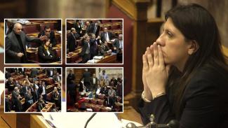 O κοινοβουλευτικός εκπρόσωπος της ΝΔ Κυριάκος Μητσοτάκης, φώναξε «Ντροπή». Επίθεση κατά της κας Κωνσταντοπούλου εξαπέλυσε ο Γιάννης Βρούτσης λέγοντας: «Έχετε συγκεντρώσει το θυμό και την οργή σχεδόν του συνόλου του Κοινοβουλίου... Οι πράξεις σας είναι επιεικώς καταχρηστικές».