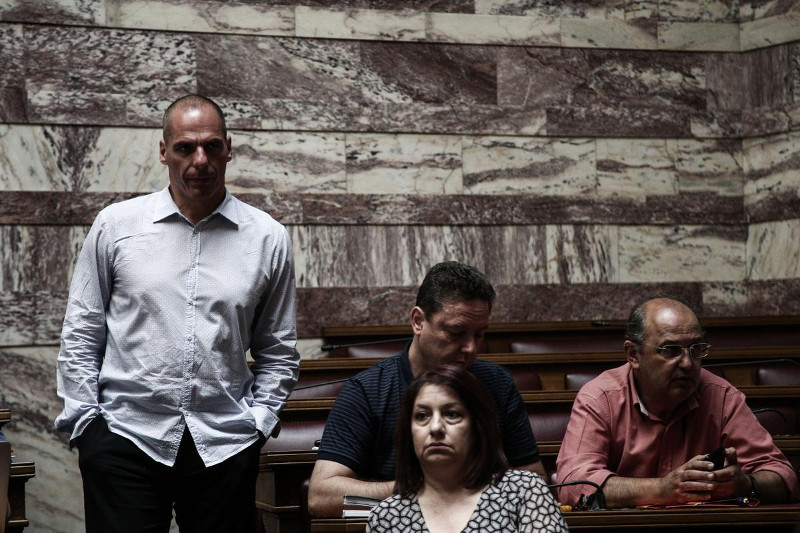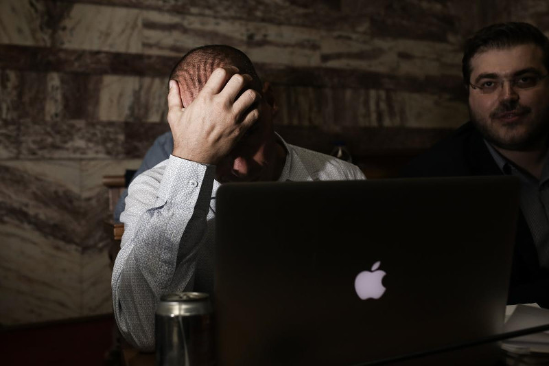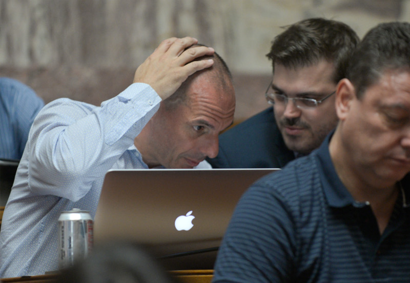 Ο πρώην υπουργός Οικονομικών Γιάνης Βαρουφάκης επέλεξε τα ορεινά έδρανα και την παρέα του υπολογιστή του που είχε ανοιχτό μπροστά του. Σε κάποια στιγμή έμοιαζε ιδιαίτερα σκεπτικός, ενώ δεν έκρυψε και τον προβληματισμό του (;) καθώς έτριβε με τα χέρια του το κεφάλι του.