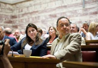Με ένα πάκο χαρτιά μπροστά του και βλέμμα βλοσυρό ο Κώστας Λαπαβίτσας καρφώνει τον φωτογραφικό φακό. Οπως επισημαίνεται από κυβερνητική πηγή, η μόνη εναλλακτική που ακούστηκε ήταν η πρόταση Λαπαβίτσα για αποδοχή του σχεδίου του Γερμανού υπουργού Οικονομικών Βόλφγκανγκ Σόιμπλε.