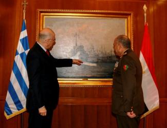 Εντυπωσιάστηκε ο Αιγύπτιος Αρχηγός Ενόπλων Δυνάμεων Αντιστράτηγος Μαχμούντ Χεγκάζυ από τον πίνακα που απεικονίζει το αντιτορπιλικό «Αδρίας» να πλέει μισοκατεστραμμένο προς την Αλεξάνδρεια και βρίσκεται στο κέντρο του γραφείου του υπουργού Εθνικής Άμυνας κ. Νίκου Δένδια.
