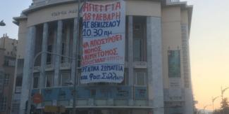 Με σκοπό να προπαγανδίσουν την αυριανή τους κινητοποίηση μέλη του ΠΑΜΕ πριν από λίγη ώρα κρέμασαν πανό στην πρόσοψη του Κρατικού Θεάτρου Βορείου Ελλάδος, στη Θεσσαλονίκη.
