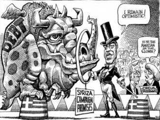 Η γελοιογραφία κάθε άλλο παρά αισιόδοξο "άρωμα" έχει για την Ελλάδα, αφού το τέρας είναι φανερά πολύ μεγαλύτερο από όσο ο κρίκος των "προεκλογικών δεσμεύσεων". Και παρότι η λεζάντα του Αλέξη Τσίπρα αναφέρει "Παραμένω αισιόδοξος", στο... background απεικονίζεται η γερμανίδα καγκελάριος, Άγγελα Μέρκελ, να κρατά το πρόγραμμα του τσίρκου στα χέρια της και να ρωτά τον διπλανό της, ο οποίος είναι ο πρόεδρος της Ευρωπαϊκής Επιτροπής, Ζαν Κλωντ Γιούνκερ: "Είναι ο μάγος ή ο κλόουν;"