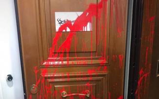 Τα μέλη του Ρουβίκωνα, τέσσερις άνδρες και μία γυναίκα, πέταξαν επίσης και μπογιές στην πόρτα του γραφείου.