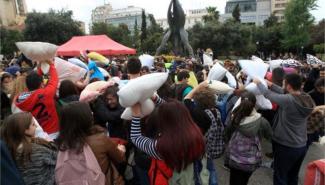 Μια πρωτότυπη «μάχη» με… μαξιλάρια, έδωσαν νέοι και νέες το μεσημέρι στην πλατεία Αριστοτέλους, στο πλαίσιο της «παγκόσμιας ημέρας μαξιλαροπόλεμου» και την ίδια ώρα με την παράλληλη διοργάνωση «μαξιλαροπόλεμου» στην Αθήνα, διασκεδάζοντας και στέλνοντας ταυτόχρονα μηνύματα μη βίας.