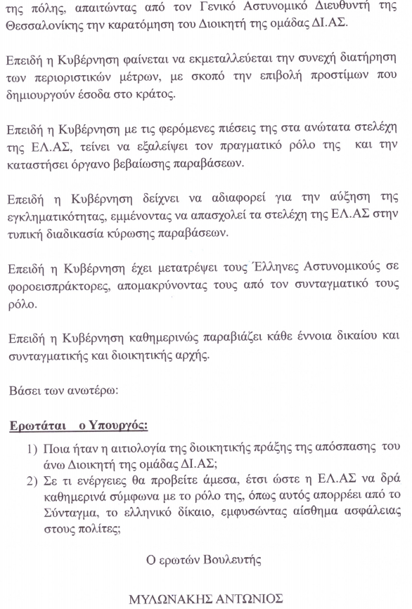 Δείτε την ερώτηση που κατατέθηκε από τον Βουλευτή της Ελληνικής Λύσης Αντώνη Μυλωνάκη προς τον Υπουργό Προστασίας του Πολίτη