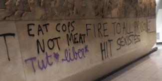 Το βράδυ της Τετάρτης, λίγο πριν τα μεσάνυχτα, μία ομάδα αγνώστων με καλυμμένα τα πρόσωπά τους, κατέβηκαν στην αποβάθρα του σταθμού Ακρόπολη του Μετρό και έγραψαν συνθήματα στους τοίχους, ενώ έβαψαν αντίγραφα αγαλμάτων που υπάρχουν στο επίπεδο της αποβάθρας.