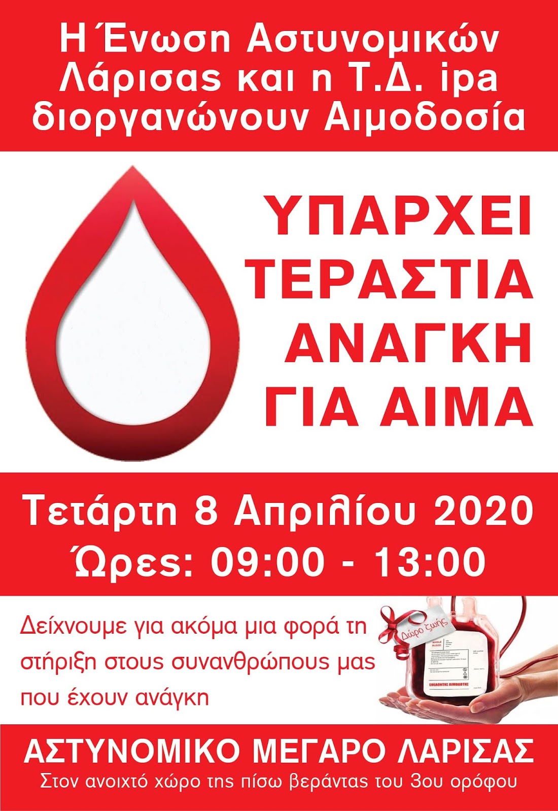 Με απόλυτη επιτυχία διεξήχθη η αιμοδοσία που διοργάνωσε η Ένωση Αστυνομικών Λάρισας και η Τοπική Διοίκηση της Διεθνούς Ένωσης Αστυνομικών την Τετάρτη 8 Απριλίου στο Αστυνομικό Μέγαρο Λάρισας, για την στήριξη των συνανθρώπων μας που έχουν ανάγκη.