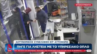 Σε στιγμιότυπα που φέρνει στη δημοσιότητα ο Alpha ο αστυνομικός καταγράφεται να κρατά το υπηρεσιακό του όπλο τη στιγμή που διαπράττει ληστεία σε βενζινάδικο.