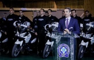 Ο Κυριάκος Μητσοτάκης συνομίλησε με ένστολους και επιθεώρησε τα νέα δίκυκλα οχήματα που θα χρησιμοποιούν στο έργο τους οι δυνάμεις ταχείας επέμβασης και καταπολέμησης του καθημερινού εγκλήματος.
