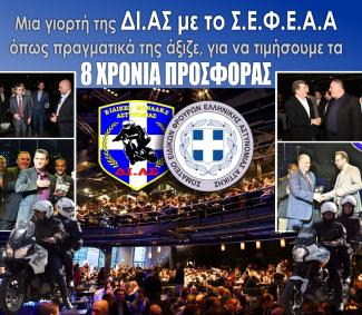 Το Σ.Ε.Φ.Ε.Α.Α και η Β' Υποδιεύθυνση της ΔΙ.ΑΣ Αττικής, οργάνωσαν και πραγματοποίησαν εορταστική εκδήλωση προς τιμήν των υπηρετούντων στις Ομάδες Δίκυκλης Αστυνόμευσης , με την ευκαιρία συμπλήρωσης οκτώ ετών συνεχούς και απρόσκοπτης προσφοράς στην υπεράσπιση της ασφάλειας των πολιτών και την προάσπιση της δημόσιας ειρήνης.