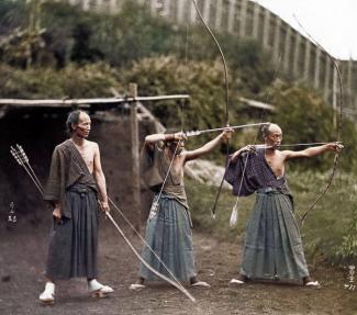 Τρεις σαμουράι εξασκούνται στην τοξοβολία, πίσω στο μακρινό 1870. Παρατηρήστε το πόσο αδύνατοι και κοντοί είναι. Η σωματική τους διάπλαση είναι αντιδιαμετρικά αντίθετη με το μέγεθος των τόξων, τα οποία ξεπερνούν κατά πολύ το ύψος των Ιαπώνων πολεμιστών.