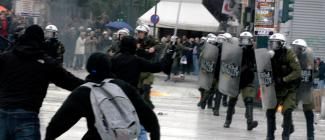 Μόλις η πορεία πλησίασε στην πλατεία Συντάγματος, μια μικρή ομάδα κουκουλοφόρων στη θέα των ΜΑΤ ξεκίνησε να πετάει πέτρες και μολότοφ προς τις αστυνομικές δυνάμεις.