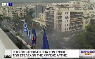 Λίγα μόλις λεπτά μετά την ανακοίνωση για την ενοχή του Νίκου Μιχαλολιάκου, ηγετικών στελεχών της Χρυσής Αυγής αλλά και των υπολοίπων συμμετεχόντων για διεύθυνση και ένταξη σε εγκληματική οργάνωση ξέσπασαν επεισόδια μεταξύ μερίδας διαδηλωτών και των αστυνομικών.
