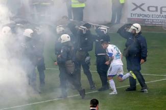 Χρειάστηκε η δυναμική παρέμβαση δύο διμοιριών των ΜΑΤ που με τις ασπίδες τους δημιούργησαν αυτοσχέδια στέγη προκειμένου να προστατέψουν τους “πράσινους” από τη ρίψη αντικειμένων και φωτοβολίδων.