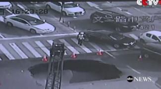 Αν και δεν πρόκειται για κάτι ασυνήθιστο στις made in Chine οδικές κατασκευές, το πράγμα εξελίσσεται τόσο γρήγορα που οι κάμερες ασφαλείας υπολογίζουν ότι χρειάστηκαν μόλις δύο λεπτά για να καταρρεύσει η άσφαλτος και να ανοίξει η μεγάλη τρύπα.