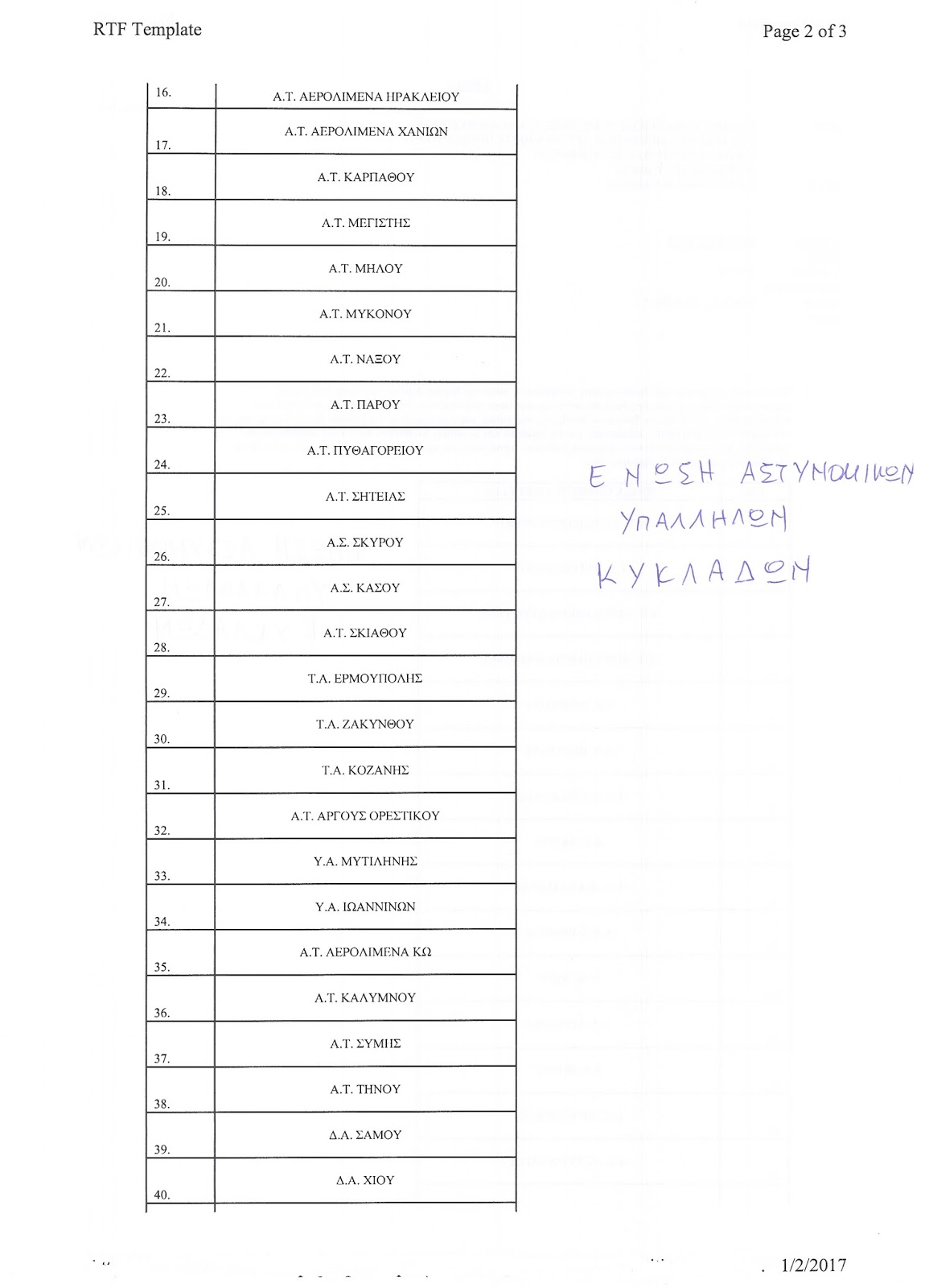Εκδόθηκε η υπ' αριθμ. 1647/17/208533 από 31-1-2017 Διαταγή Α.Ε.Α., για την ενίσχυση Αστυνομικών Υπηρεσιών προς κάλυψη εποχιακών αναγκών κατά την τρέχουσα θερινή περίοδο.
