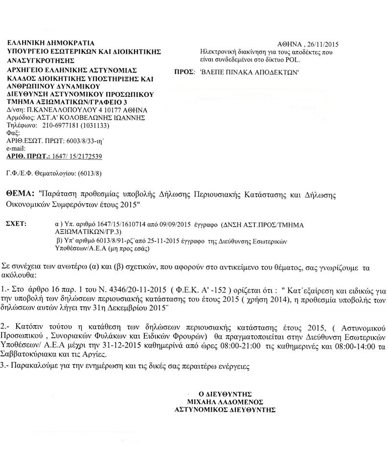 Κατ εξαίρεση και ειδικως για την υποβολή των δηλώσεων περιουσιακής κατάστασης (Πόθεν έσχες) του έτους 2015 η προθεσμία υποβολής των δηλώσεων αυτών λήγει την 31 Δεκεμβρίου 2015.