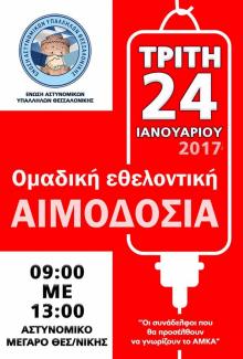 Η Ενωση Αστυνομικών Θεσσαλονίκης διοργανώνει αύριο Τρίτη 24-01-2017 ομαδική εθελοντική αιμοδοσία στο Αστυνομικό Μέγαρο Θεσσαλονίκης.