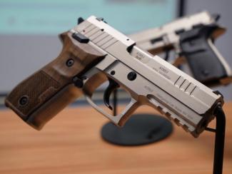 Ο διευθυντής πωλήσεων του ομίλου FIME (εισαγωγέας του Rex Zero 1), και ο επικεφαλής της ανάπτυξης στο Arex, επιδεικνύουν δύο νέα πιστόλια.