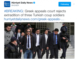 Ενδέχεται να υποβληθούν σε βασανιστήρια και να δεχθούν απάνθρωπη συμπεριφορά, ύστερα δε και μετά τις διακηρύξεις για επαναφορά της θανατικής ποινής». Πριν λίγες ημέρες το Συμβούλιο Εφετών εξέδωσε αρνητική απόφαση για το αίτημα έκδοσης όσον αφορά άλλους τρεις από τους στρατιωτικούς, ενώ τις επόμενες ημέρες θα κριθεί η υπόθεση και για τους άλλους δύο από αυτούς. Οι οκτώ στρατιωτικοί κρατούνται στο ολυμπιακό χωριό και σύμφωνα με πληροφορίες, παρατάθηκε για ένα τρίμηνο η διοικητική κράτησή τους στο πλαίσιο της διαδικασίας του ασύλου που έχουν ζητήσει.