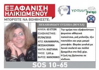 Νεκρή εντοπίστηκε χτες το μεσημέρι, μέσα σε χαράδρα στα Νταμάρια Ευκαρπίας, η 63χρονη Βούλα Πεχλιβανίδου, από την Καλαμαριά, η οποία αναζητούνταν από τις 8 Απριλίου από τους οικείους της και είχε ενεργοποιηθεί για την εύρεσή της και «Silver Alert».