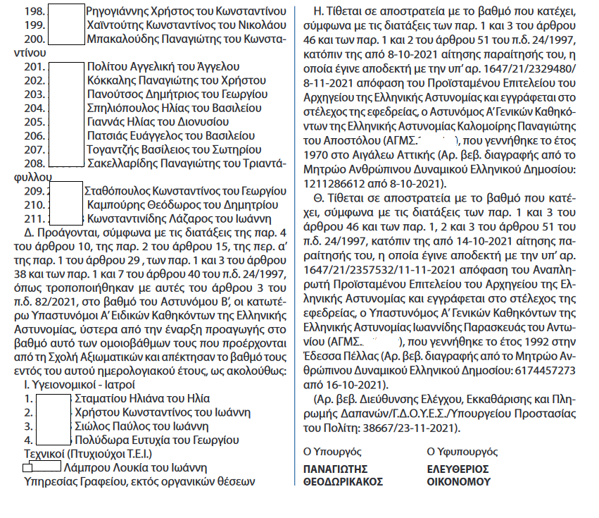 Δημοσιεύτηκε σήμερα στην Εφημερίδα της Κυβερνήσεως, νέα Υπουργική Απόφαση με προαγωγές Αξιωματικών της ΕΛ.ΑΣ.