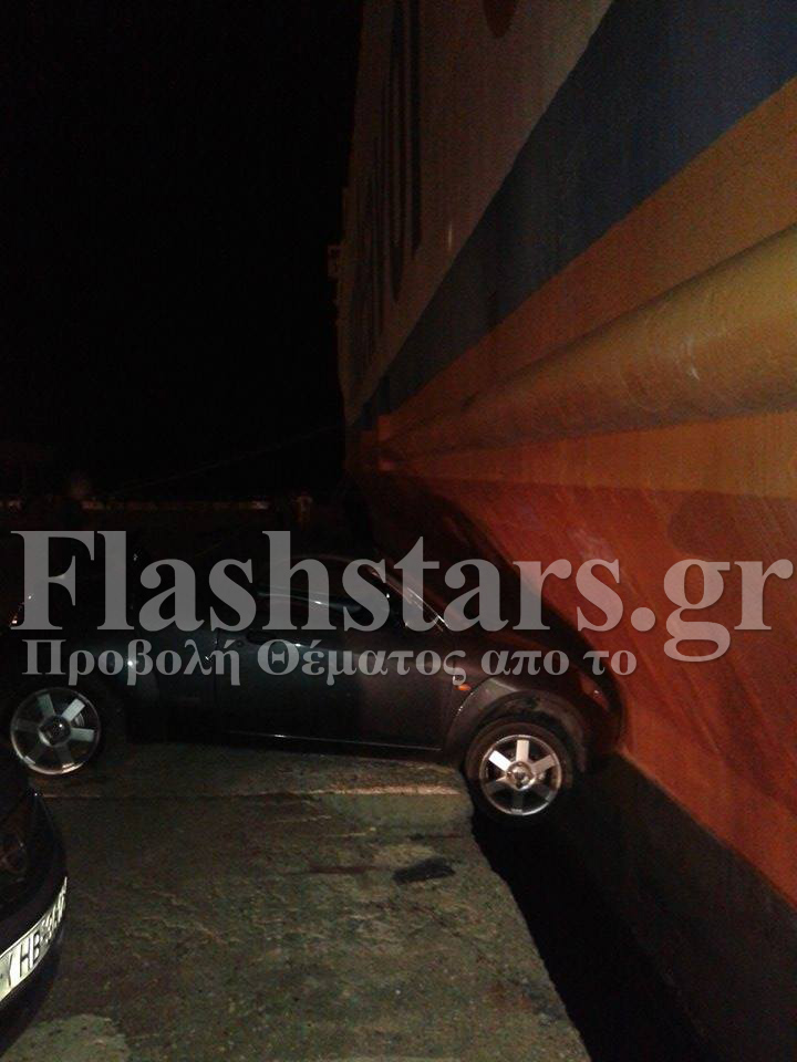 Στις αποκλειστικές εικόνες που δημοσιεύει το flashstars.gr φαίνεται το αυτοκίνητο στο χείλος του λιμανιού να στηρίζεται πάνω στο πλοίο.
