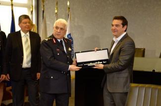 Εκτός από το… δωράκι του Γιάννη Πανούση, ένα κείμενο 40 σελίδων με τα αιτήματα που αφορούν στις ανάγκες της Αστυνομίας και της Πυροσβεστικής, ο αρχηγός της Αστυνομίας, αντιστράτηγος Δημήτρης Τσακνάκης επέδωσε στον πρωθυπουργό ένα ξιφίδιο.