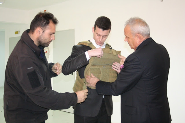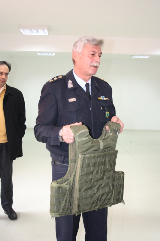 Στη συνέχεια πραγματοποίησε επίδειξη αντοχής στα νέα αλεξίσφαιρα γιλέκα που κατασκεύασε η εταιρεία, καθώς όπως είπε, δεν είναι μόνο οι σφαίρες που μπορεί να απειλήσουν τους Αστυνομικούς, βάζοντας στη θέση του αστυνομικού που δέχεται τα χτυπήματα τον υιό Σούκο.