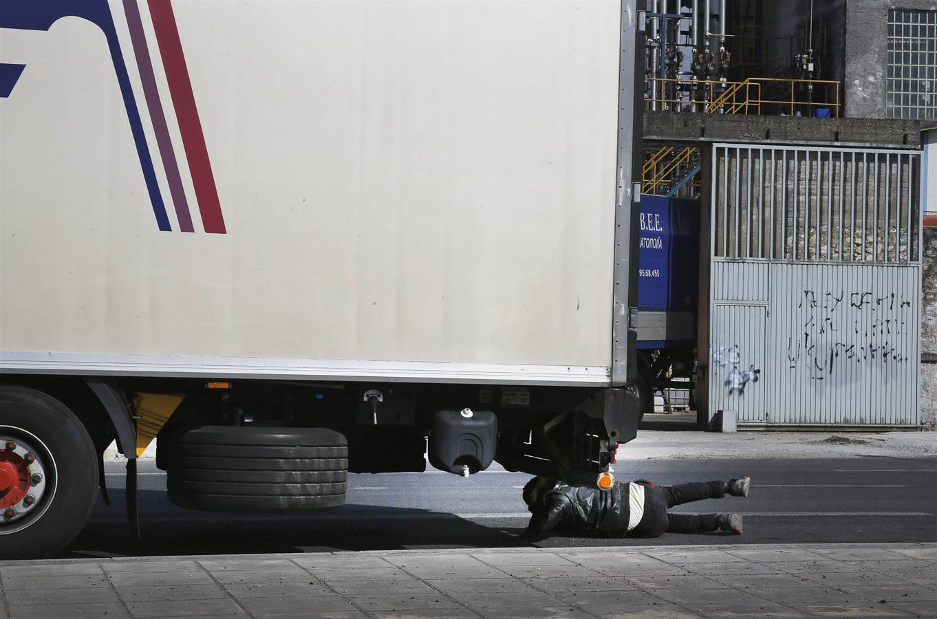 28 Απριλίου 2015. Ενας Αφρικανός μετανάστης στην Πάτρα προσπαθεί να τρυπώσει κάτω από ένα φορτηγό το οποίο πραγματοποίησε μια σύντομη στάση περιμένοντας να ανάψει πράσινο. Οι μετανάστες προσπαθούν να μπουν λαθραία στα πλοία με προορισμό την Ιταλία κρυμμένοι κάτω από τα φορτηγά. Οι περισσότερες προσπάθειες αποτυγχάνουν