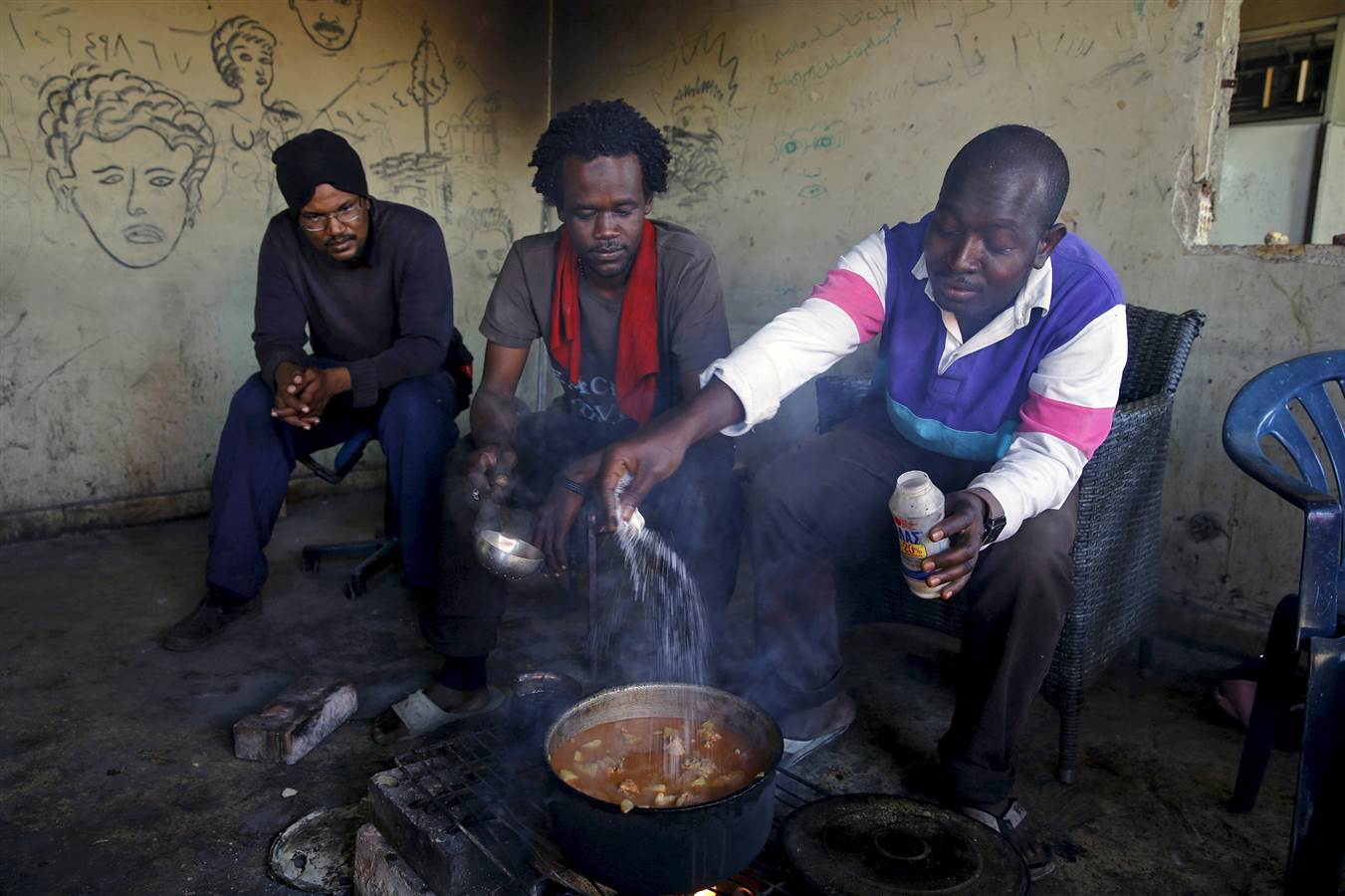 4 Μαΐου 2015. Σουδανοί μετανάστες μαγειρεύουν σε αυτοσχέδια εστία μέσα στο εγκαταλειμμένο εργοστάσιο όπου ζουν.