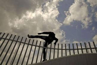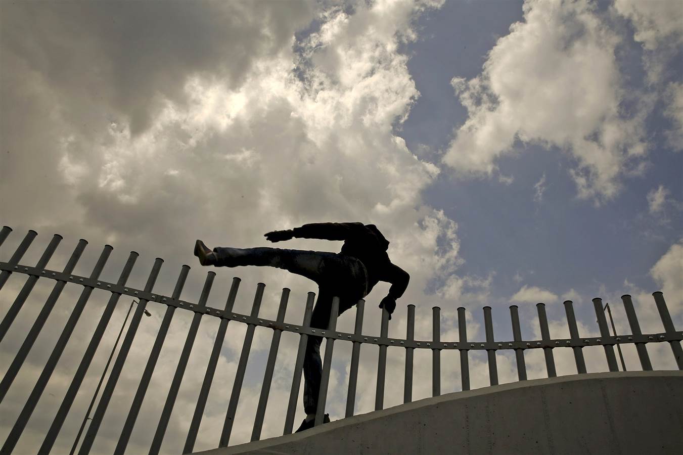 28 Απριλίου 2015. Αφρικανός μετανάστης πηδά πάνω από φράχτη για να προλάβει το πλοίο