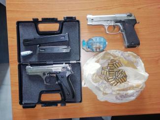 Από αστυνομικούς της ανωτέρω Υπηρεσίας πραγματοποιήθηκε έρευνα στην εν λόγω οικία και σε περιβάλλοντες χώρους, όπου βρέθηκαν και κατασχέθηκαν δύο πιστόλια, γεμιστήρας, χειροβομβίδα και κάλυκες.