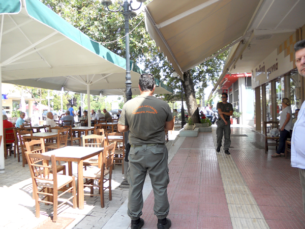 Οσον αφορά δε τα τραπεζοκαθίσματα και το χώρο που δικαιούται ο κάθε επαγγελματίας, ο δήμαρχος Γ. Τσώνης από την πλευρά του ήτανε καθησυχαστικός και είπε μιλώντας στην "Ε" ότι η δημοτική αρχή πράττει το αυτονόητο. Δηλαδή εφόσον υπάρχει Δημοτική Αστυνομία, καθήκον της είναι να βγει και να κάνει ελέγχους για το αν τηρούνται οι κανονισμοί. Αυτό δεν σημαίνει ότι θα πάρουν οι δύο δημοτικοί αστυνομικοί ένα μπλοκάκι και θα αρχίσουν να γράφουν πρόστιμα μέσα στην τουριστική περίοδο. Αλλά όπως επεσήμανε και ο δήμαρχος πεζοί και επισκέπτες δικαιούνται την ελεύθερη πρόσβαση παντού. Επιπλέον στις πλατείες θα πρέπει να υπάρχει μια τάξη και όλοι οι καταστηματάρχες να εξυπηρετούνται βάσει του νόμου. «Δεν έχουμε τη διάθεση να γράψουμε κόσμο και να ταλαιπωρήσουμε τους επαγγελματίες, στα πλαίσια λειτουργίας της Δημοτικής Αστυνομίας λογικό είναι να κάνουμε ελέγχους», ανέφερε συγκεκριμένα ο Γ. Τσώνης. Πρόσθεσε δε ότι όπου χρειάστηκε έγιναν παρατηρήσεις, χωρίς να υπάρξουν χρηματικά πρόστιμα - επισημαίνοντας παράλληλα πως η δημοτική αρχή σχεδιάζει κάποιες αλλαγές, χωρίς να αναφερθεί συγκεκριμένα. Τόνισε ωστόσο πως «θα μπούνε τα πράγματα στη θέση τους - τώρα λόγω της γενικότερης οικονομικής κατάστασης δεν θέλουμε να φορτώσουμε με άλλα έξοδα τους επαγγελματίες, αλλά να γίνει ένα καλοπροαίρετο νοικοκύρεμα και να υπάρχει ευταξία για να εξυπηρετείται όλος ο κόσμος και να περνάει ελεύθερα από την πλατεία».