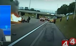 Ενα βίντεο με τις δραματικές προσπάθειες ενός αστυνομικού να βγάλει έναν οδηγό από το αυτοκίνητό του, το οποίο έχει τυλιχτεί στις φλόγες, βλέπει το φως της δημοσιότητας.
