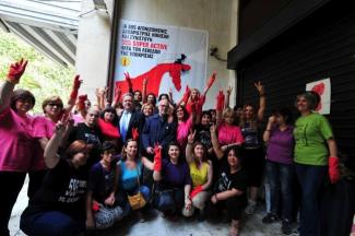 Σε πανηγυρικό κλίμα και φορώντας τα κόκκινα γάντια τους οι καθαρίστριες του υπουργείου Οικονομικών γιορτάζουν σήμερα την επιστροφή στην εργασία τους.