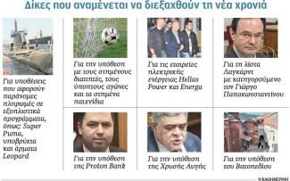 Και ενώ οι ανακρίσεις και οι έρευνες της δικαιοσύνης για κρίσιμες και σημαντικές υποθέσεις βρίσκονται σε εξέλιξη και τη νέα χρονιά, σημαντικές δίκες αναμένεται να καθορίσουν το δικαστικό πεδίο το 2015, καθώς ήδη έχουν προσδιοριστεί για εκδίκαση -μέσα στους πρώτους μήνες του νέου χρόνου- οι δίκες για την υπόθεση της Proton Bank, των εταιρειών ηλεκτρικής ενέργειας Hellas Power και Energa, ενώ η οριστική παραπομπή σε δίκη από τον Αρειο Πάγο της υπόθεσης του Βατοπεδίου δρομολογεί την εκδίκασή της μέσα στο 2015.