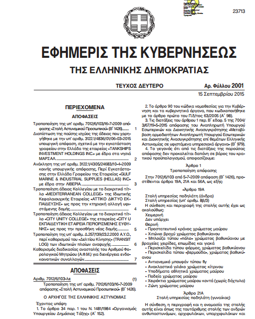 Παραθέτουμε αντίγραφο του Φ.Ε.Κ. 2001/15-09-2015 στο οποίο δημοσιεύθηκε η απόφαση του Αρχηγού της ΕΛ.ΑΣ.