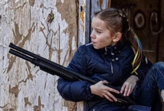 Η εικόνα συγκλονίζει. Στο διαλυμένο παράθυρο ενός σπιτιού, ένα κοριτσάκι 9 ετών, με ένα γλυφιτζούρι στο στόμα και κοτσιδάκια με τα χρώματα της Ουκρανίας, κρατάει ένα όπλο, περιμένοντας τον ρωσικό στρατό.