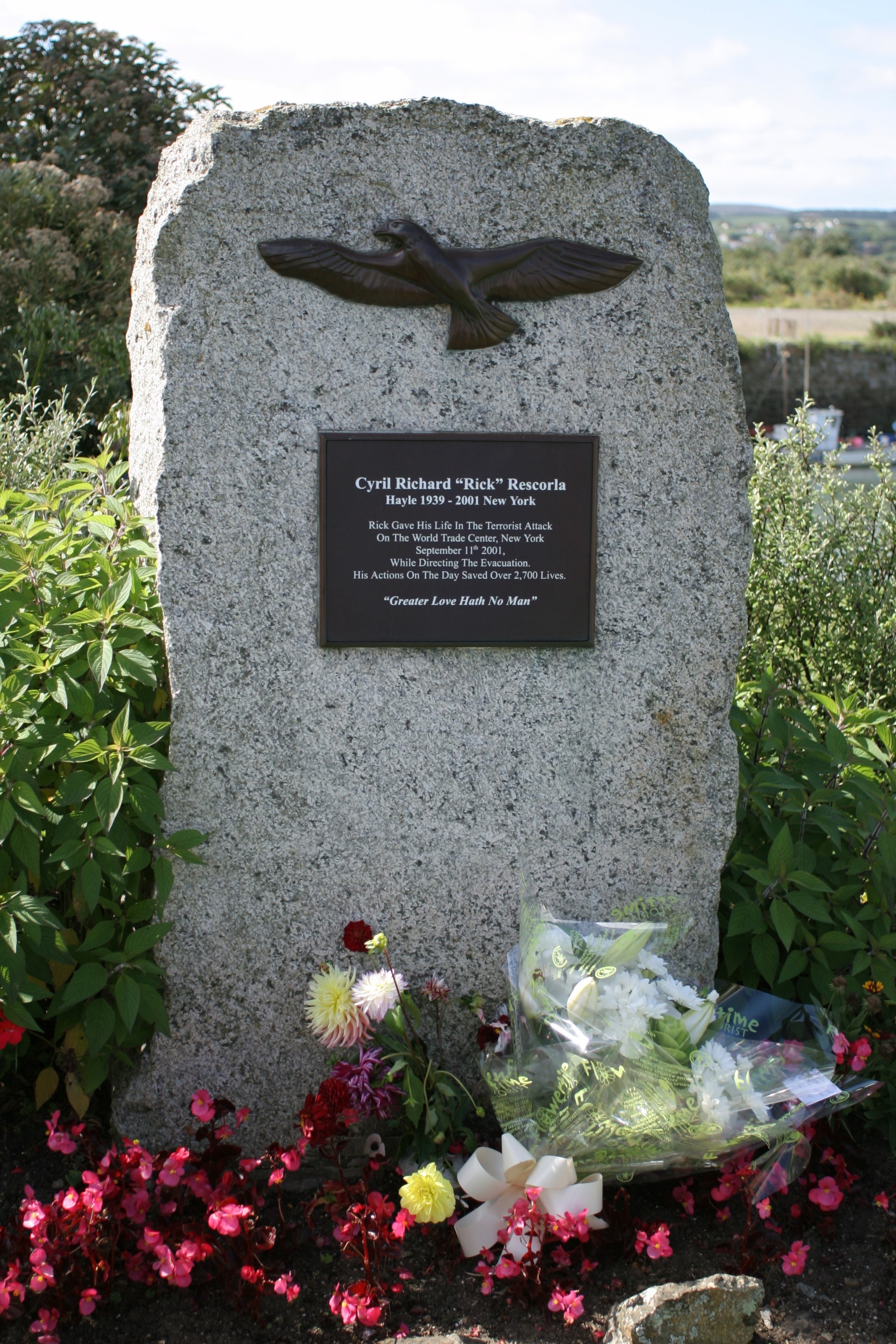 Το μνημείο για τον Ρικ Ρεσκόρλα, στη γενέτειρά του, το Χέιλ της Κορνουάλης του Ηνωμένου Βασιλείου. Ο ίδιος με την ηρωική του αυτοθυσία και τις προσηλωμένες στο καθήκον πράξεις του την 11η Σεπτεμβρίου 2001, έμεινε πιστός στην προσωπική του κοσμοθεωρία, η οποία ανέφερε πως «οι πραγματικοί ήρωες των μαχών είναι οι νεκροί».