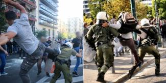 Οπως κατέγραψε ο φωτογραφικός φακός, ο διαδηλωτής όταν ξέσπασαν τα επεισόδια με τους αστυνομικούς αποφάσισε να επιτεθεί κατά των ανδρών των ΜΑΤ. Με κινήσεις που παραπέμπουν σε άνθρωπο που έχει γνώση πολεμικών τεχνών, ο διαδηλωτής έκανε άλμα και χτύπησε με κλωτσιά που θυμίζει καρατέκα έναν αστυνομικό των ΜΑΤ.