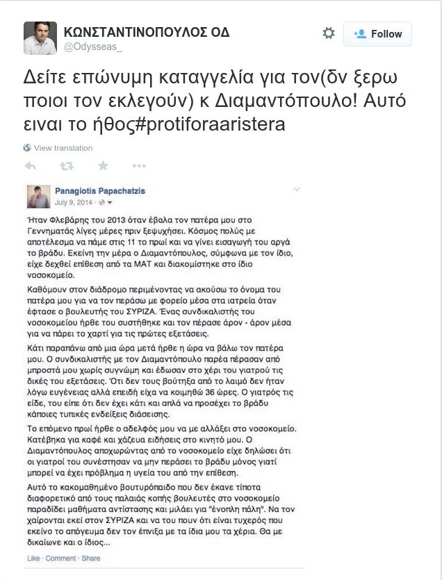 «Δείτε επώνυμη καταγγελία για τον(δεν ξερω ποιοι τον εκλεγούν) κ Διαμαντόπουλο! Αυτό ειναι το ήθος#protiforaaristera» σχολίασε ο βουλευτής του ΠΑΣΟΚ.