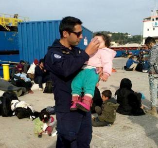 Συγκίνηση προκάλεσε η φωτογραφία του Μεσολογγίτη Λιμενικού Χρήστου Βούρβαχη, που τον δείχνει να κρατά στην αγκαλιά του ένα κοριτσάκι άρτι αφιχθέν από τη Συρία στη Λέρο μαζί με τους γονείς του.